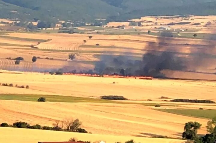Tekirdağ'ın Malkara ilçesinde çıkan anız yangınında yaklaşık 200 dönüm biçilmiş buğday tarlası kül oldu....