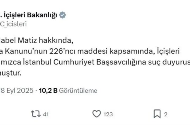 İçişleri Bakanlığı, şarkıcı Mabel Matiz hakkında Türk Ceza Kanunu'nun 226'ncı unsuru çerçevesinde cürüm duyurusunda...